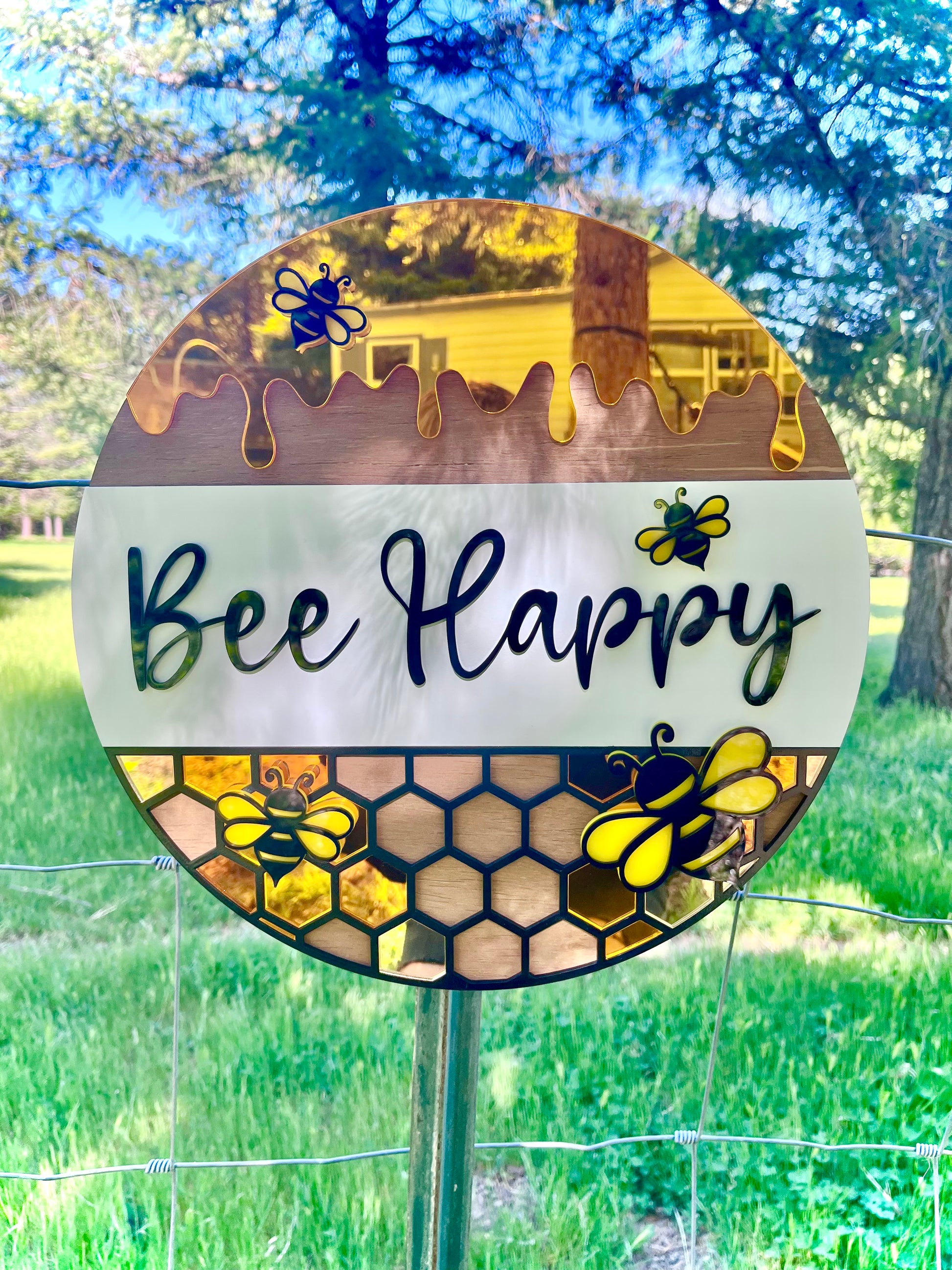 This Bee Happy sign is the perfect sign to make you, well happy! This is a 14"x14" wood round with amber mirrored acrylic for the honey drip, white wood for the middle banner, and black wood for the honeycomb. With 3 different hues of mirrored acrylic, amber, copper, and gold, inside the honeycomb! The bees are made from yellow and black acrylic, and the Bee Happy is also out of black acrylic.