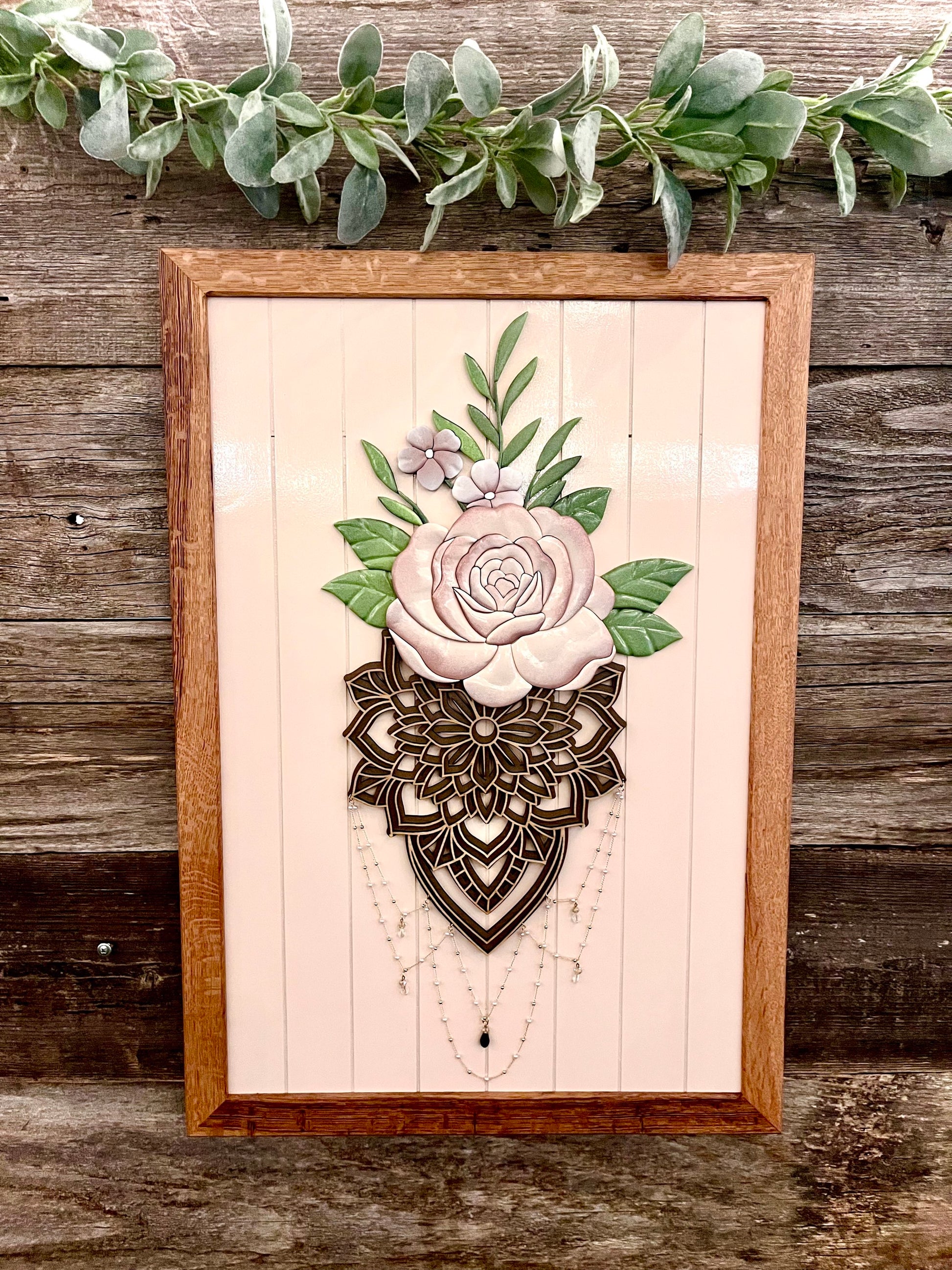 This beautifully designed Floral Mandala piece features a black oak frame, intricate flower and mandala designs, and a stunning rose gold chain with attached pendants. It also comes with a French cleat hanger, making it easy to display in any setting including your home, office, or beauty salon. Sized at 18x26", it is a stunning addition to any space.