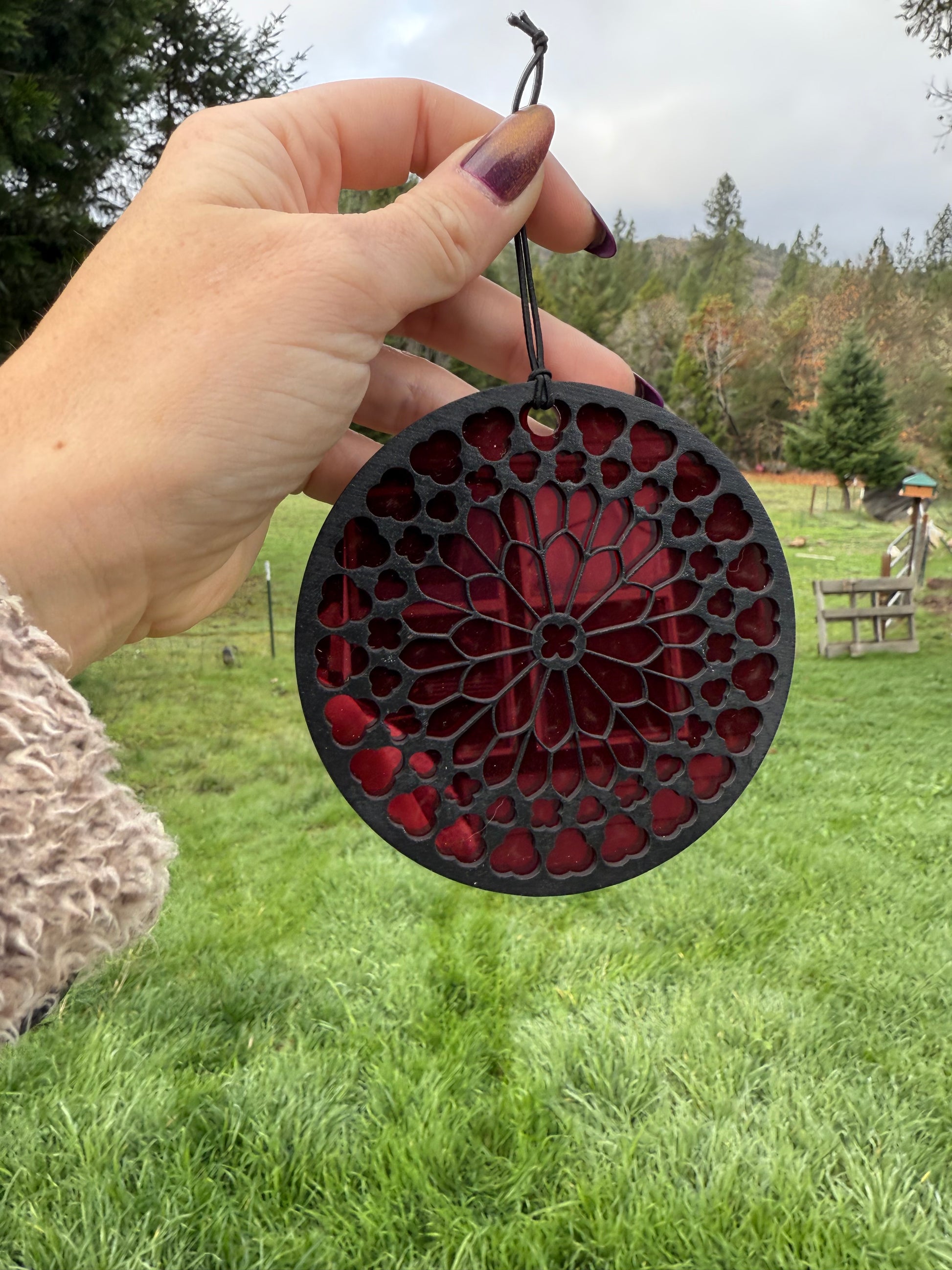 Gothic inspired window ornaments with a deep red mirrored acrylic with black window on top. Choose from the round design, or the classic arch design!