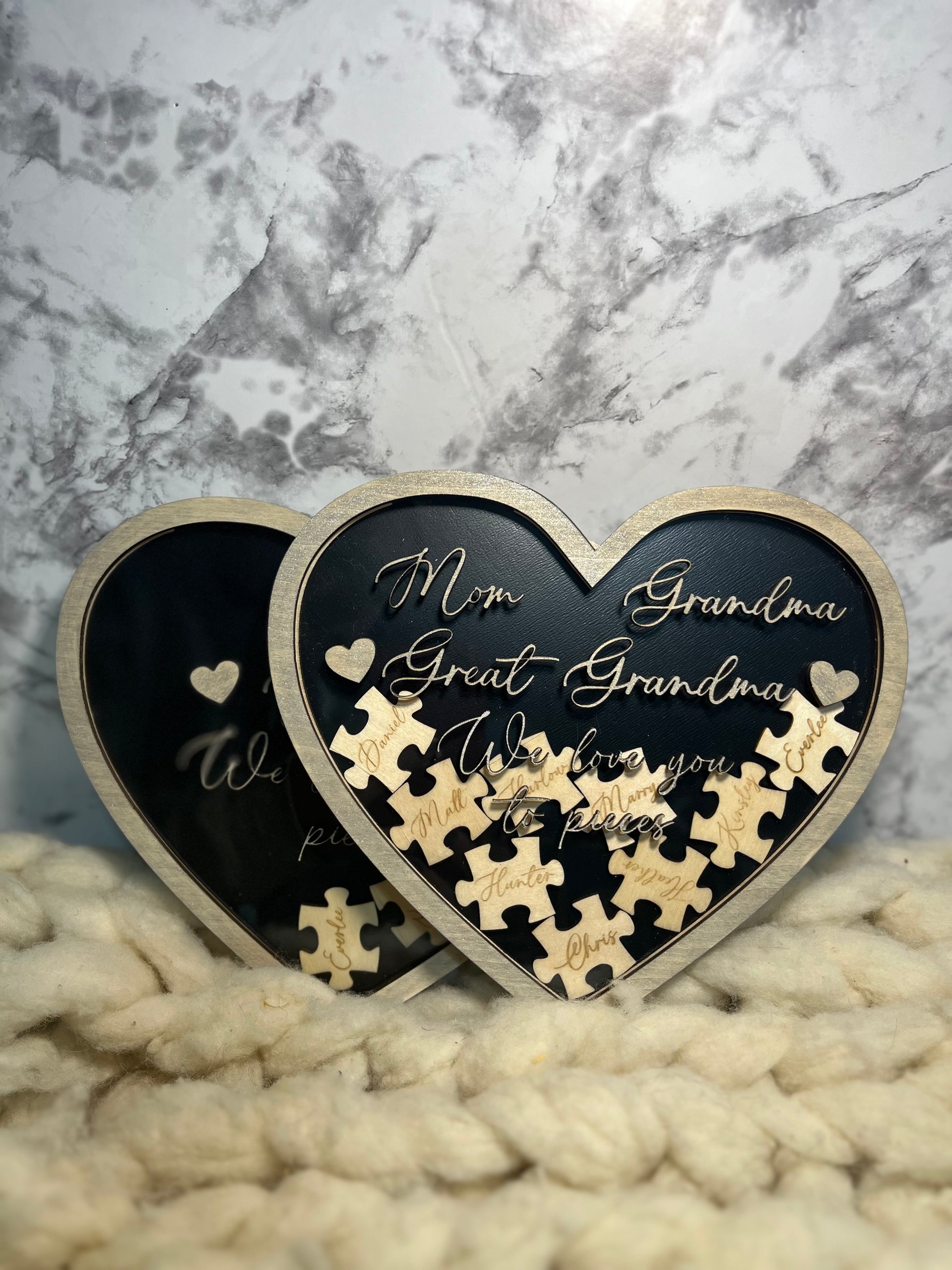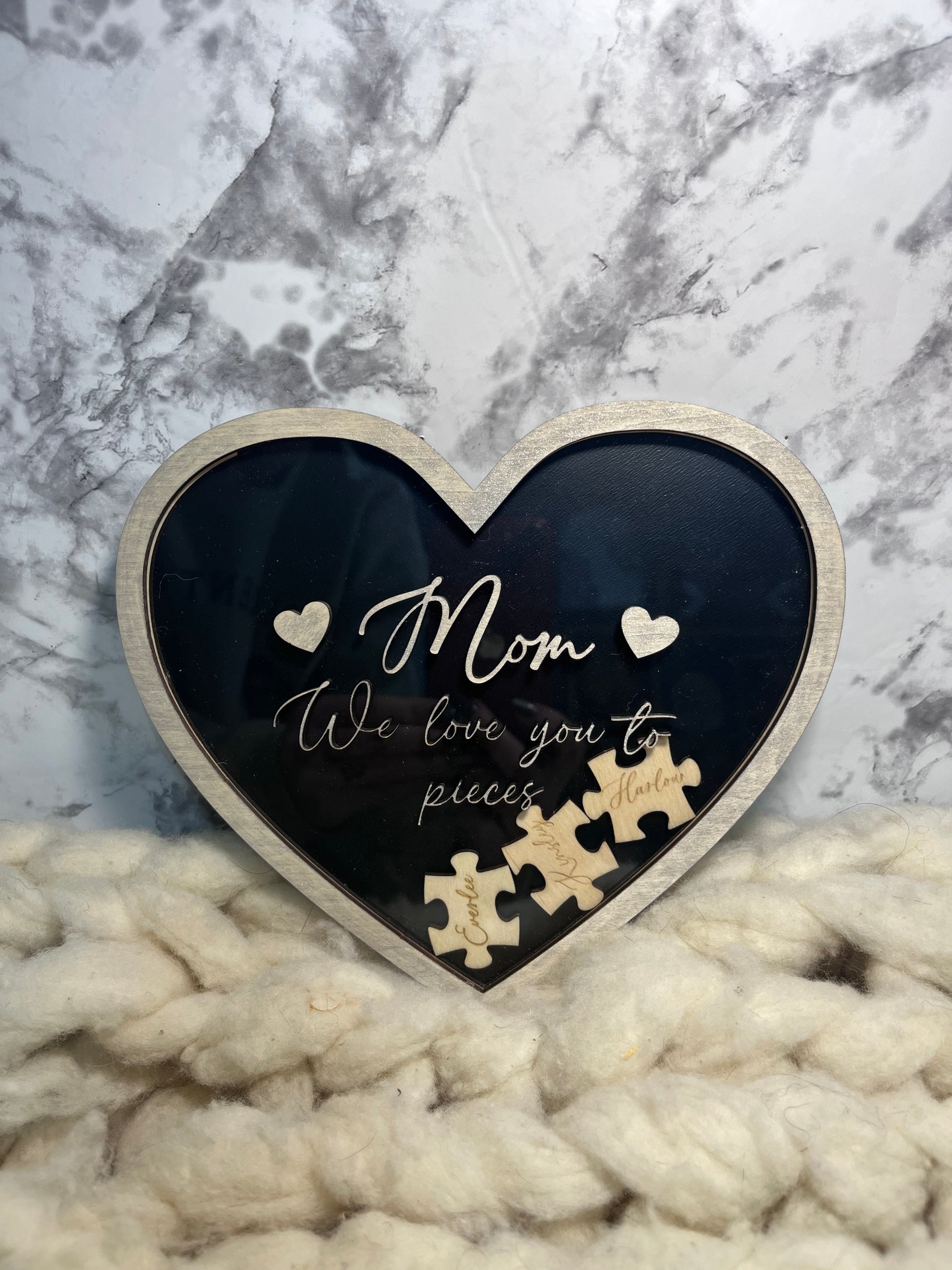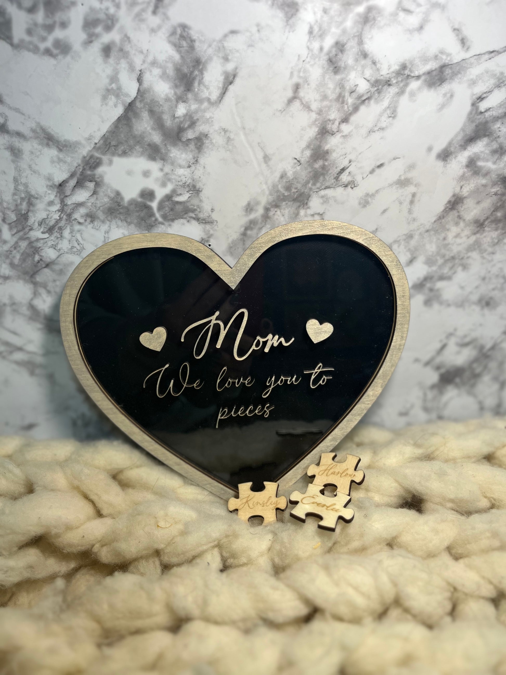 Surprise the wonderful mom in your life this Mothers Day with a gift that can grow with your family or theirs! This heart-shaped puzzle is the perfect option. The top slot allows for easy addition of puzzle pieces. Currently offered in a natural wood color with the quote "We love you to pieces".